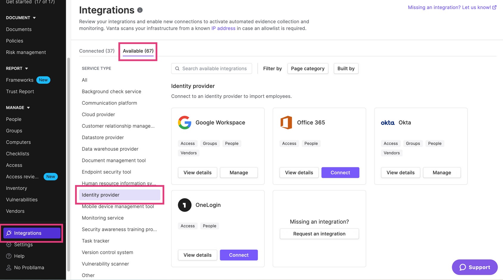 - Integration and Compatibility: Vanta can integrate with over 300 tools and platforms commonly used in organizational workflows. This top-of-the-line compatibility with existing tools ensures that organizations can seamlessly blend compliance management into their existing processes without disruption.