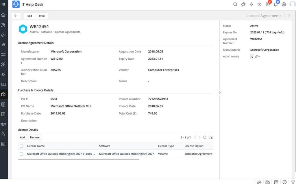 An advantage of ServiceDesk Plus is that it offers the big picture of how much you spend on licenses, how they are used, and more. At the same time, it also offers granular tracking information like the devices on which the software is installed, who uses it, how it is used, and more.